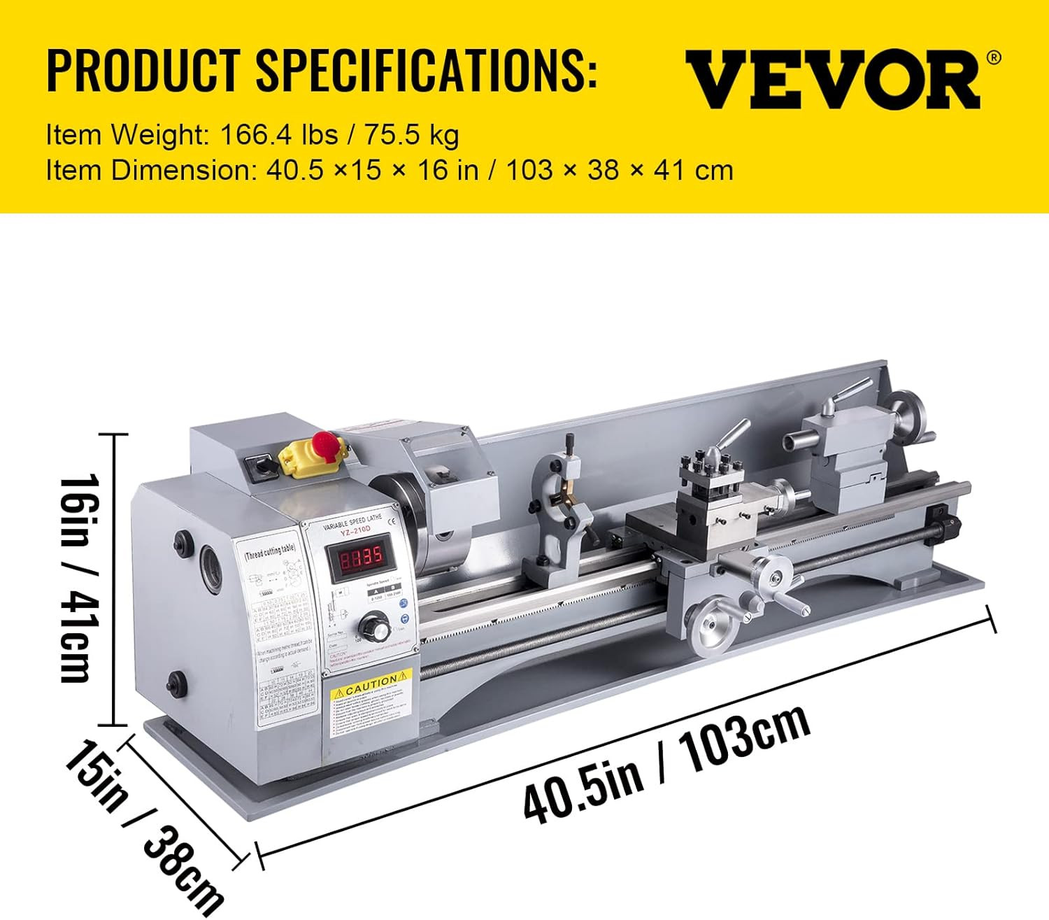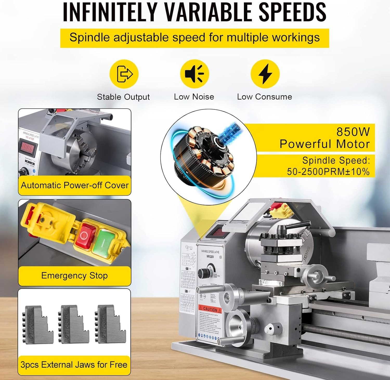 【INFINITELY VARIABLE SPEEDS】Revolving Speed Range: 50-2500. The mini lathe machine